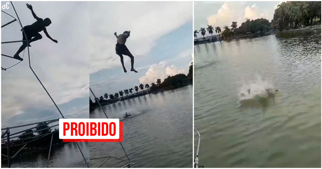 Os garotos ainda sobem em uma estrutura metálica de 5 metros para pular no lago, o que aumenta o risco de acidentes. (veja vídeo acima)
