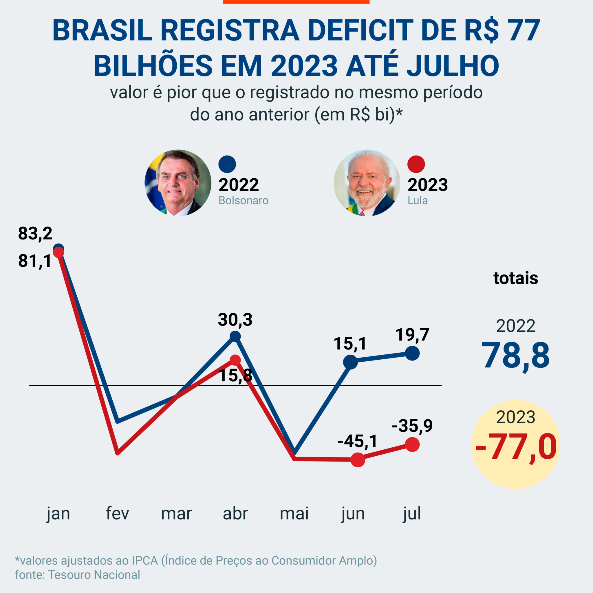 O resultado é o 2º pior da série histórica do mês. Só perde para julho de 2020, quando o deficit foi de R$ 109,6 bilhões (ajustado pelo IPCA).