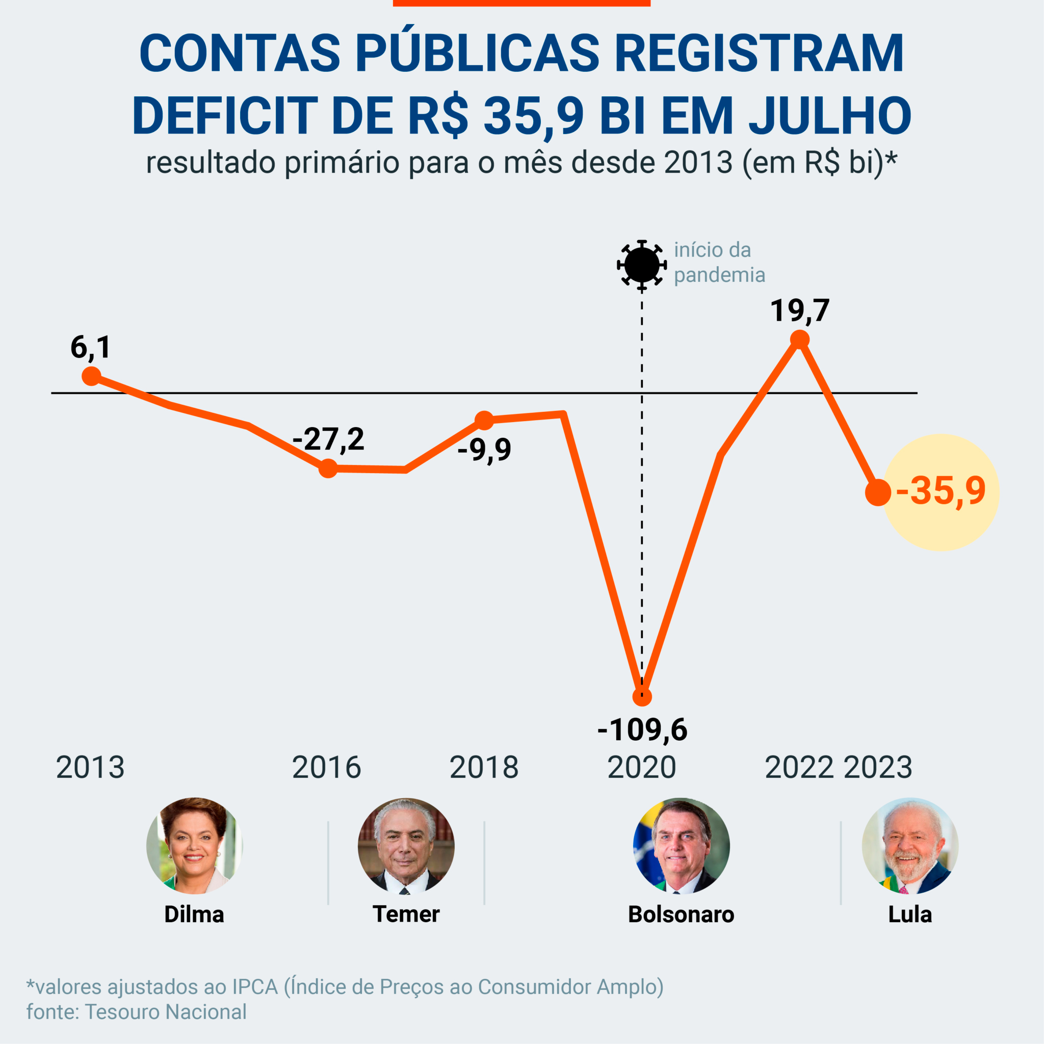 O governo federal registrou deficit primário de R$ 35,9 bilhões em julho. No mesmo período do ano anterior, o superavit foi de R$ 19,7 bilhões (ajustado pelo IPCA).