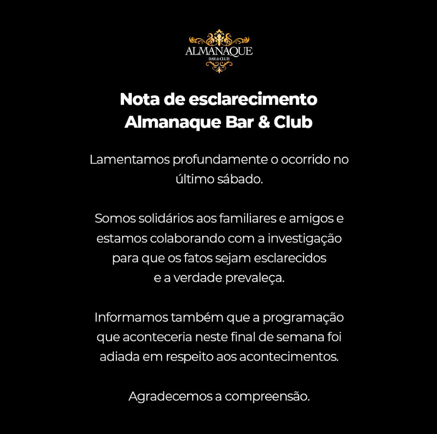 “Lamentamos profundamente o ocorrido no último sábado. Somos solidários aos familiares e amigos e estamos colaborando com a investigação para que os fatos sejam esclarecidos e a verdade prevaleça. Informamos também que a programação que aconteceria neste final de semana foi adiada em respeito aos acontecimentos. Agradecemos a compreensão”, diz a nota.