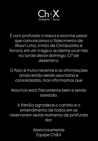 É com profunda tristeza e enorme pesar que comunicamos o falecimento de Mauri Lima, irmão de Chitãozinho e Xororó, em um trágico acidente ocorrido na tarde deste domingo, 07 de dezembro