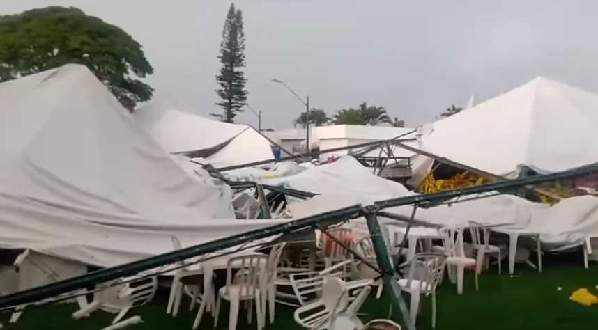 Nesta quinta-feira (9), na sede da Associação de Pais e Amigos dos Excepcionais (Apae), em Araraquara (SP), a chuva e o vento derrubaram tendas na Feira da Bondade. O evento foi cancelado e está programado para voltar na sexta (10).