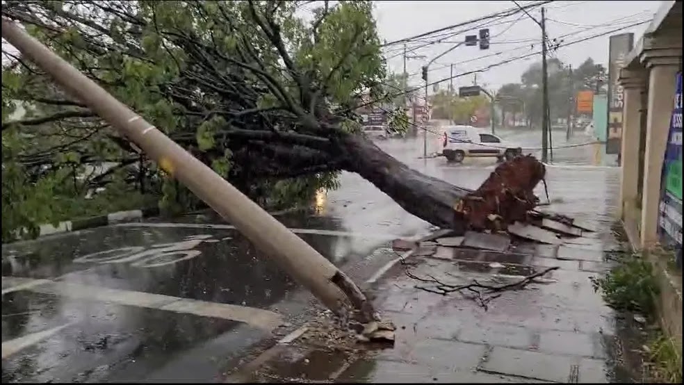 A árvore que caiu e bloqueou as duas vias é visível nas imagens. Além disso, um poste caiu como resultado da situação.
