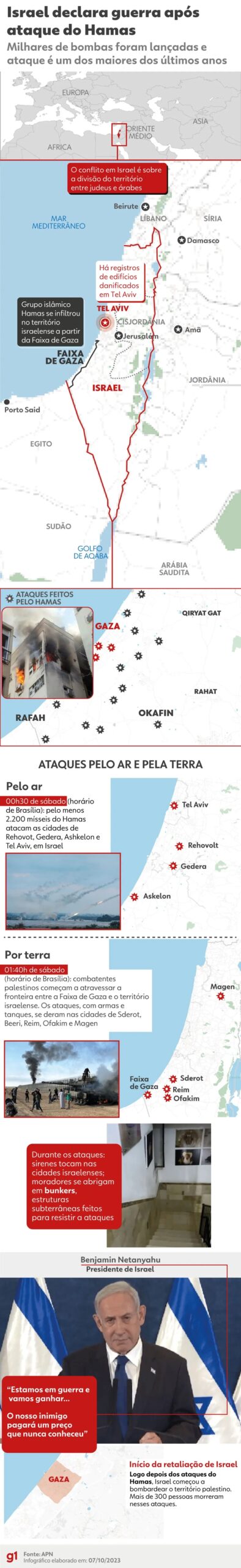 “Estamos em guerra e vamos ganhar”, disse o primeiro-ministro do Israel, Benjamin Netanyahu. “O nosso inimigo pagará um preço que nunca conheceu.”