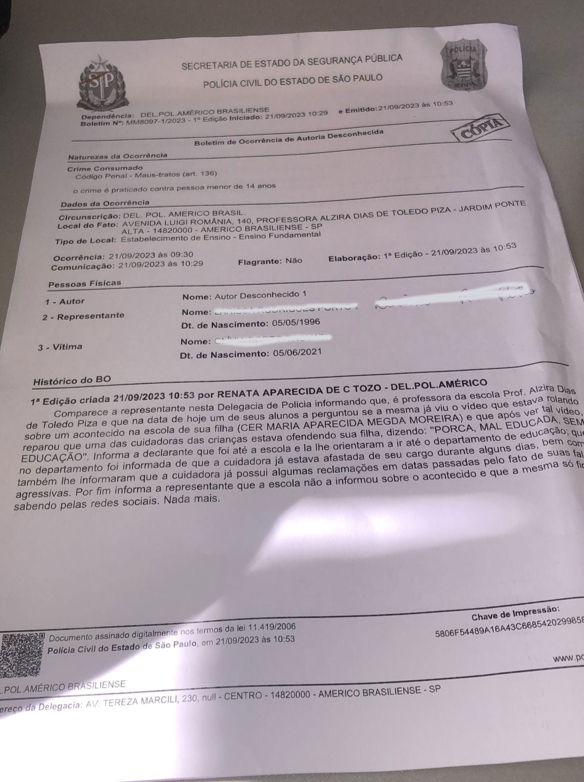 Um crime de maus-tratos contra pessoa menor de 14 anos (art. 136) do código penal ocorreu no CER Maria Aparecida Megda Moreira em Américo Brasiliense. No vídeo claramente se ve a data do ocorrido, 20 de setembro. Um Boletim de ocorrência foi elaborado por uma Professora da escola Prof. Alzira Dias de Toledo Pizza no últmo dia 21 de setembro. No B.O a professora diz ter tomado conhecimento do vídeo por intermédio de um de seus alunos, onde uma possível cuidadora ao direcionar-se a outra colega de trabalho diz.