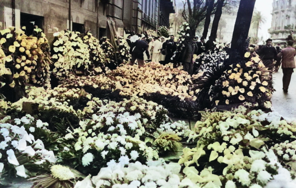| Após a morte de Eva Perón, flores se acumularam em frente ao Ministério do Trabalho e do Bem-Estar em Buenos Aires / Colorido por IA – Michel Belli |