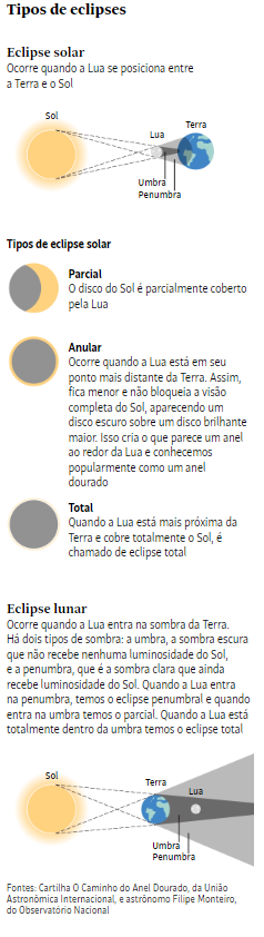 São Paulo está fora da faixa da totalidade do eclipse, ou seja, quando o Sol é totalmente coberto pelo disco lunar. Nesse caso, o tamanho aparente da Lua é menor do que o do Sol e o eclipse é conhecido como eclipse anular, justamente porque a Lua deixará passar um anel de luz, o chamado anel de fogo. Então, em São Paulo haverá um eclipse parcial, ou seja, cerca de 40% do disco solar será assombreado pela Lua”, explica Filipe Monteiro, astrônomo do Observatório Nacional, unidade de pesquisa vinculada ao Ministério da Ciência, Tecnologia e Inovação.