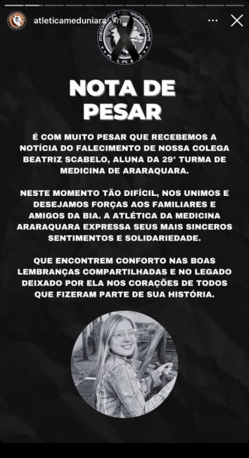 “É com muito pesar que recebemos a notícia do falecimento da nossa colega Beatriz Scabelo, aluna da 29ª Turma de Medicina de Araraquara”, declarou a atlética em uma nota oficial.