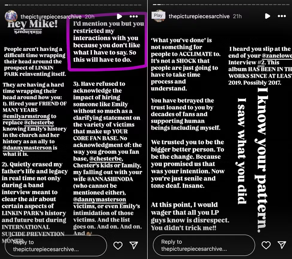 “Ei, Mike. As pessoas não estão com dificuldade para aceitar a perspectiva de que o Linkin Park se reinvente. Elas têm dificuldade para aceitar que você: 1) Contratou sua amiga de muitos anos Emily Armstrong para substituir Chester Bennington, sabendo da história de Emily com a Igreja da Cientologia e de sua ligação com Danny Masterson”, escreveu Jaime.