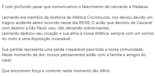 A Atlética do curso de Educação Física da FAG e a instituição emitiram notas de pesar, expressando suas condolências e destacando o impacto que o casal tinha na comunidade acadêmica. Leonardo era secretário da Atlética de Educação Física e reconhecido por seu carisma e dedicação.