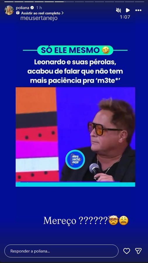 A declaração não passou despercebida por Poliana Rocha. A influenciadora compartilhou o trecho da entrevista em suas redes sociais e reagiu com bom humor, provocando seus seguidores ao escrever: “Mereço isso?”. A postagem gerou milhares de comentários, muitos deles entrando na brincadeira e outros elogiando a espontaneidade do casal.