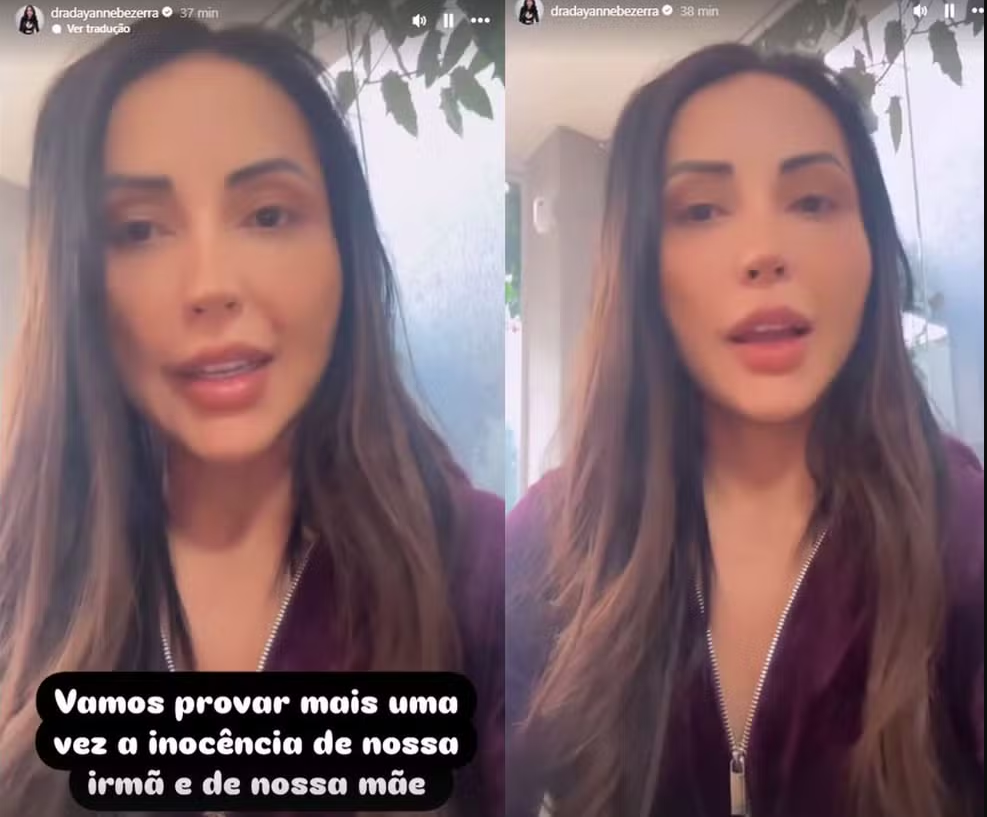 Em uma série de vídeos postados no Instagram, Dayanne se pronunciou após a prisão da irmã e da mãe. “Temos uma vida pública e um compromisso com nossos seguidores. Antes que a mídia espalhe mentiras, estou aqui para explicar o ocorrido. Hoje pela manhã, a Polícia Civil de Pernambuco cumpriu mandados de prisão preventiva contra minha irmã, Deolane Bezerra, e minha mãe, Solange Alves”, afirmou.