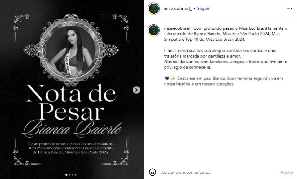 A organização do concurso Miss Eco Brasil divulgou uma nota de pesar nas redes sociais, lamentando a perda: