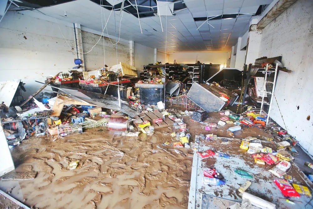 Moradores pegam alimentos da lama em mercado destruído no RS