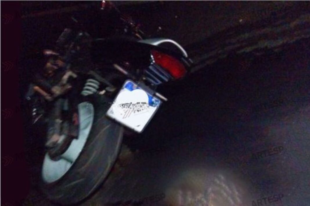 Imagem mostra a motocicleta Honda CB 600 Hornet após colisão traseira com caminhão, registrada na SP‑255, km 71,200, em Américo Brasiliense (SP). O acidente resultou em uma vítima fatal.