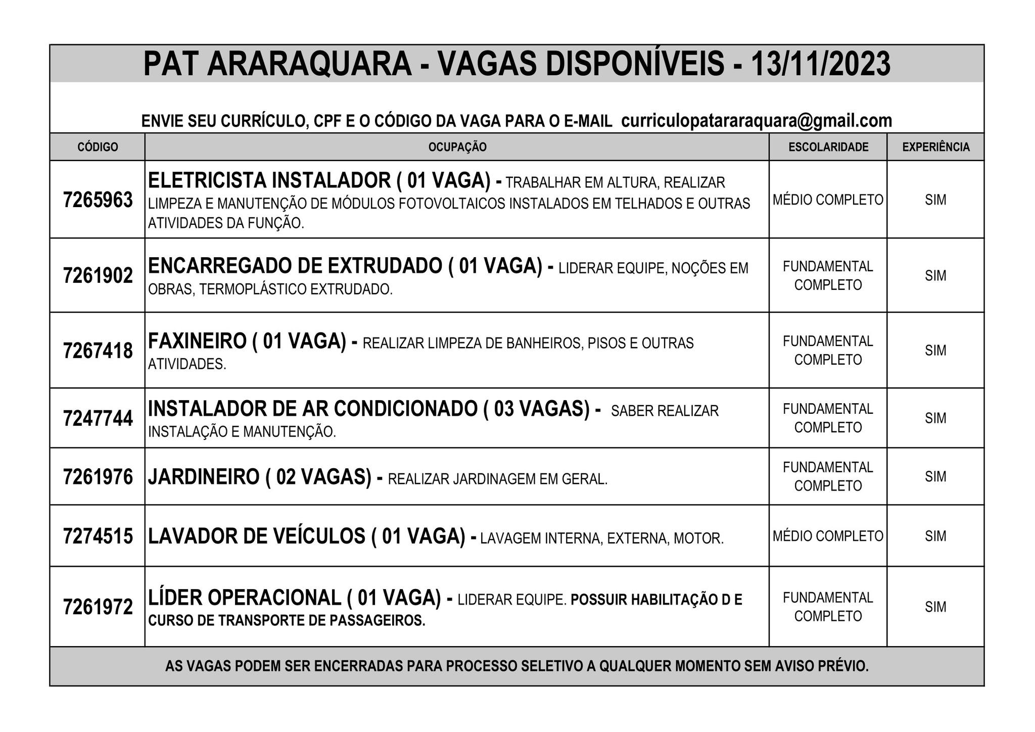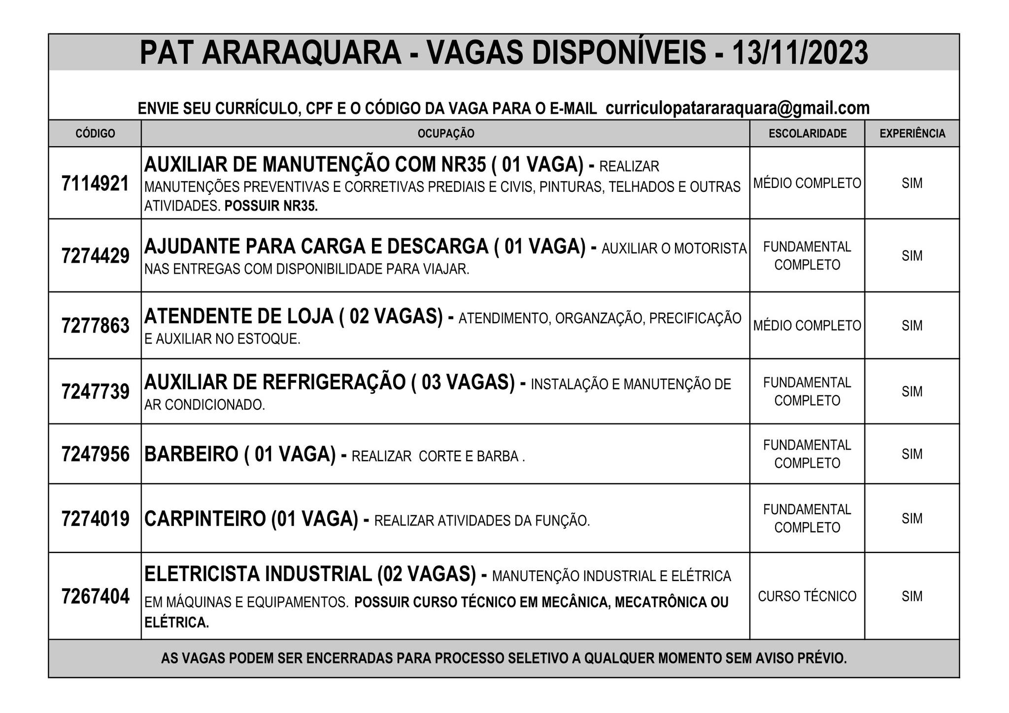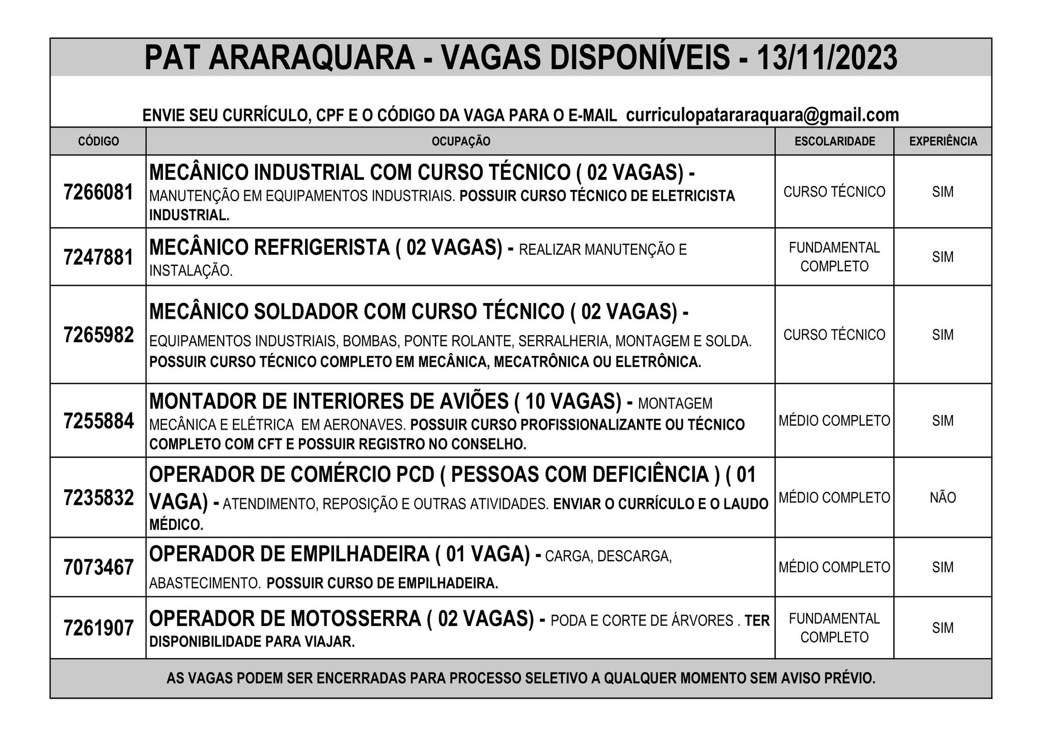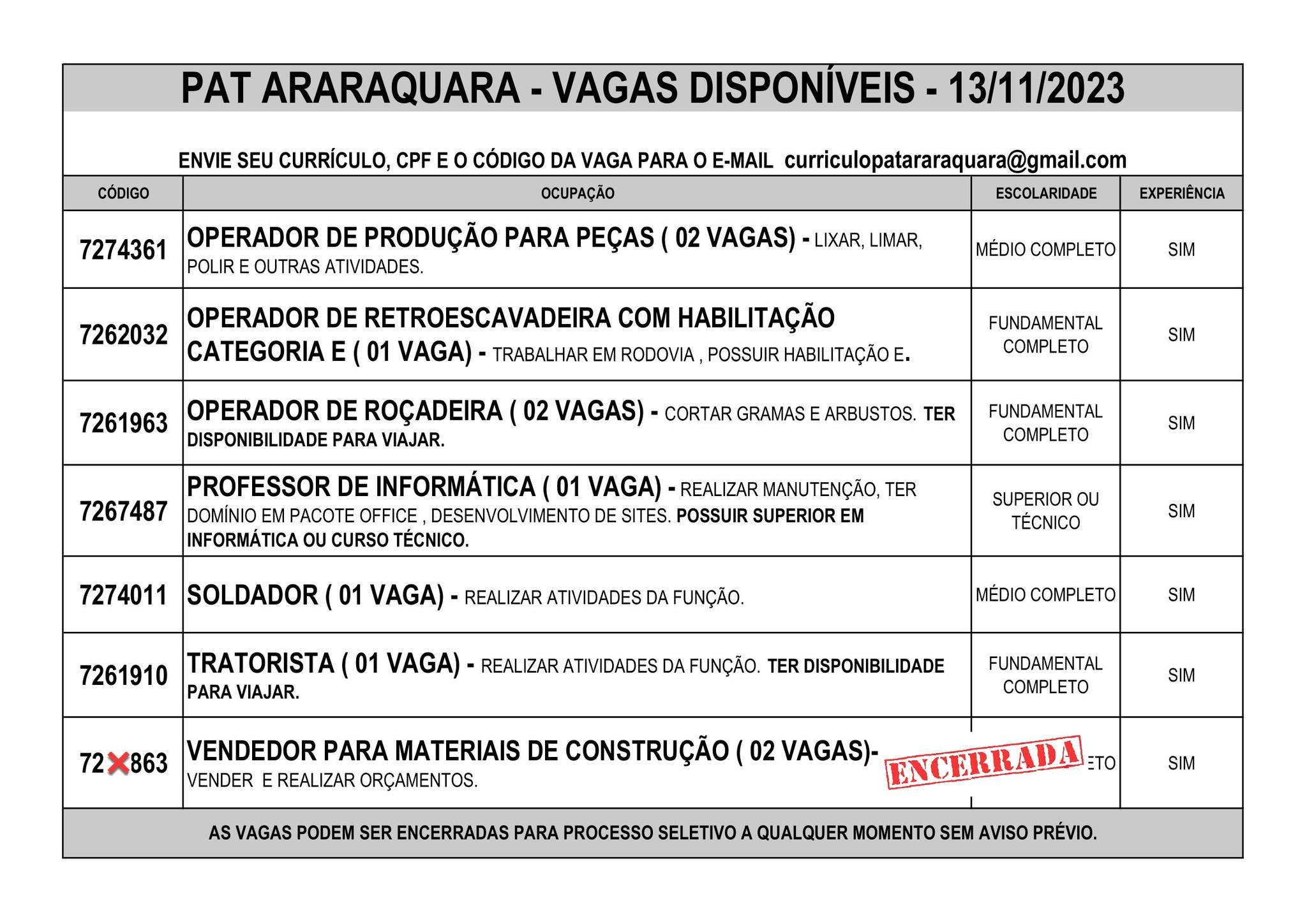 Os candidatos que estão interessados em qualquer posição de trabalho devem enviar seu currículo atual e atualizada para o e-mail curriculopatararaquara@gmail.com, juntamente com o seu CPF e o código da vaga pretendida.