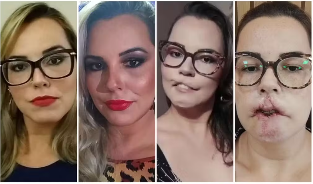A Influenciadora Mariana Michelini, de Matão, exibe a transformação ao longo do tempo: 1 – Outubro de 2020, antes da harmonização; 2 – Maio de 2021, após a harmonização; 3 – Outubro de 2023, sem o lábio superior; 4 – Janeiro de 2024, após a primeira cirurgia de reconstrução — Foto: Arquivo Pessoal