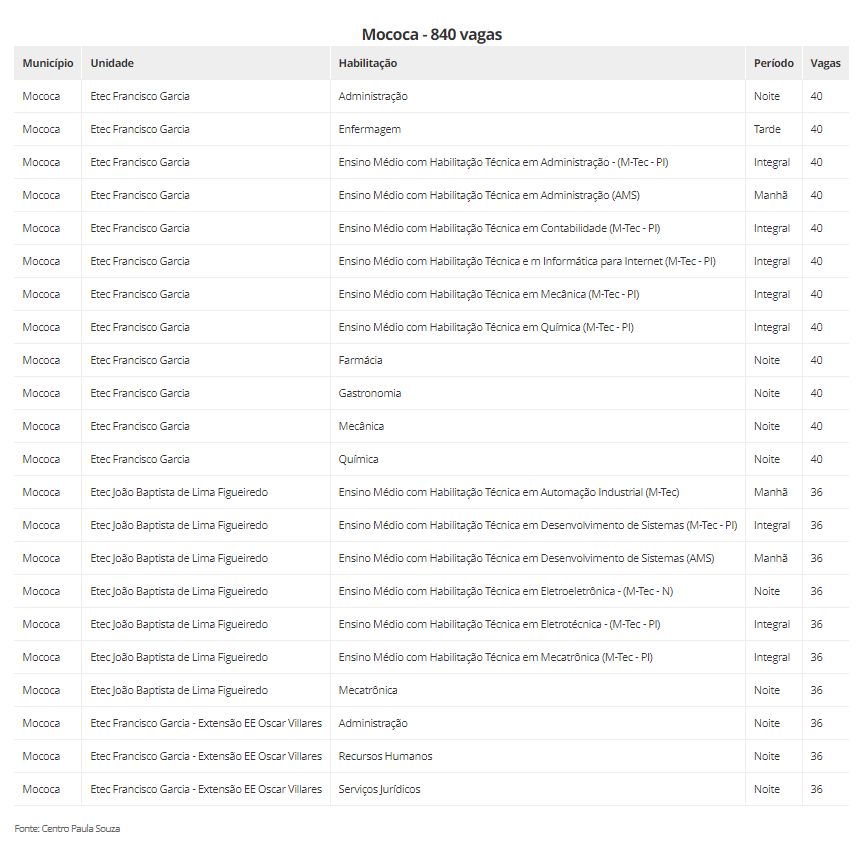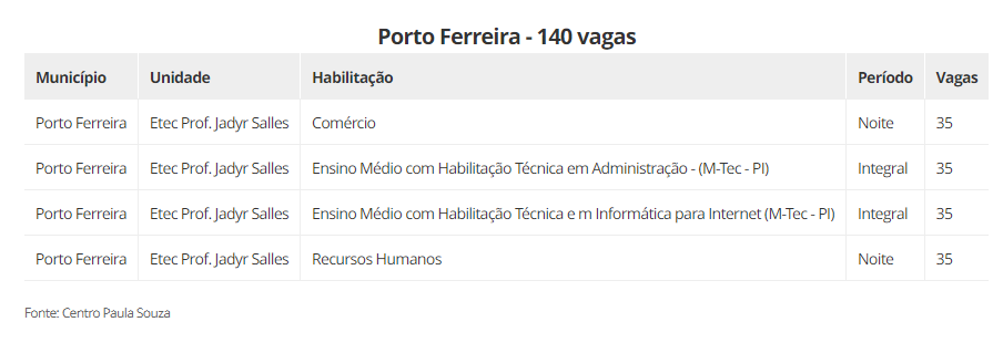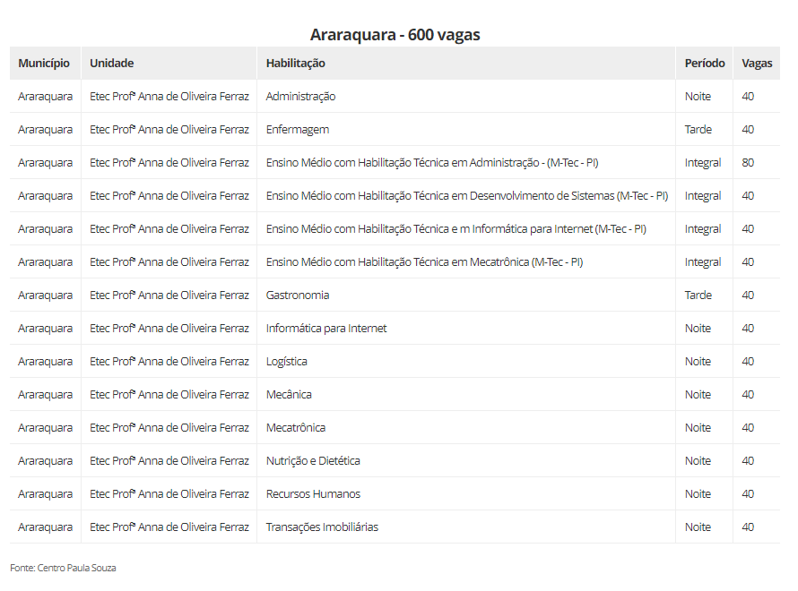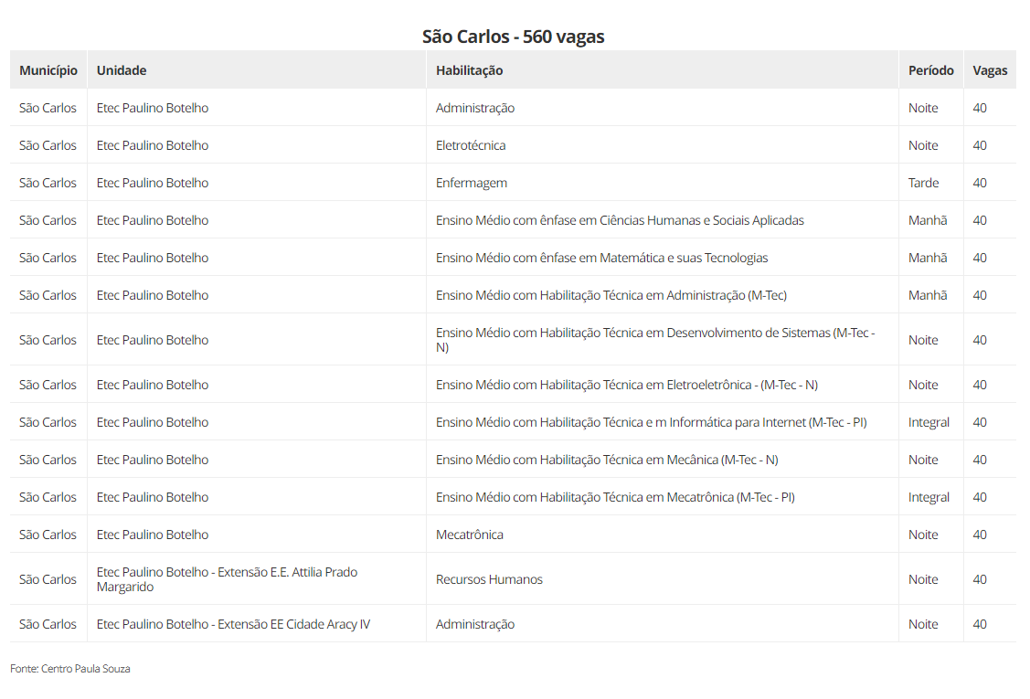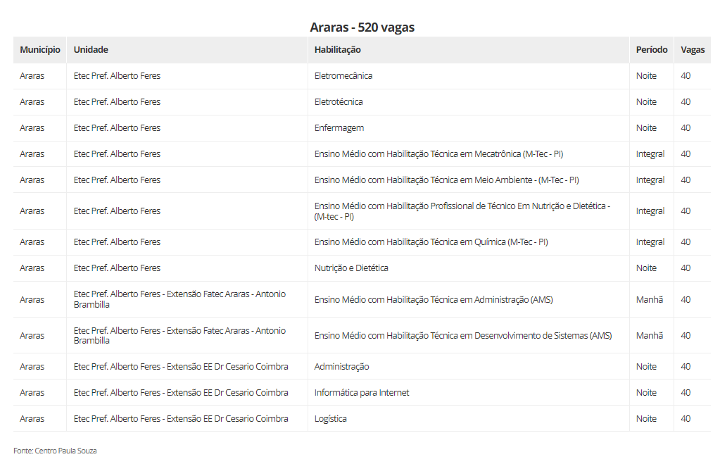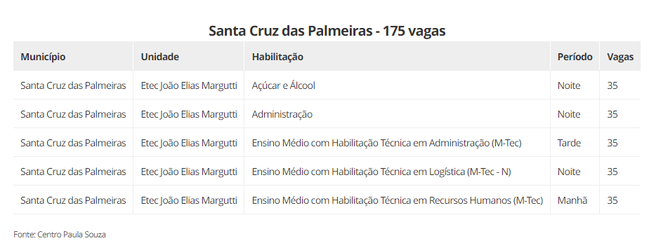 As vagas estão distribuidas em 22 cidades, são elas: Aguaí (240), Araraquara (600), Araras (520), Caconde (40), Casa Branca (200), Conchal (40), Ibaté (120), Leme (320), Matão (430), Mococa (840), Pirassununga (320), Porto Ferreira (140), Rincão (40) vagas, Rio Claro (440), Santa Cruz das Palmeiras (175), Santa Rita do Passa Quatro (80), São Carlos (560), São João da Boa Vista (40), São José do Rio Pardo (240), Tambaú (40), Tapiratiba (40) e Vargem Grande do Sul (200).