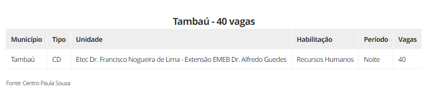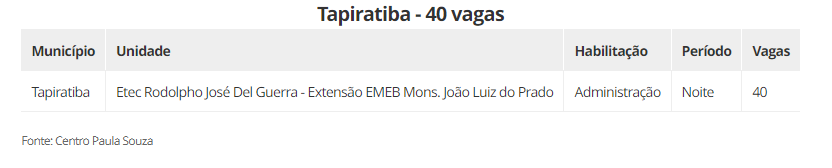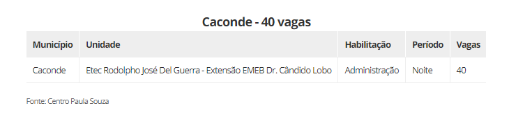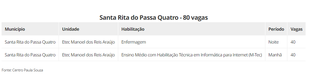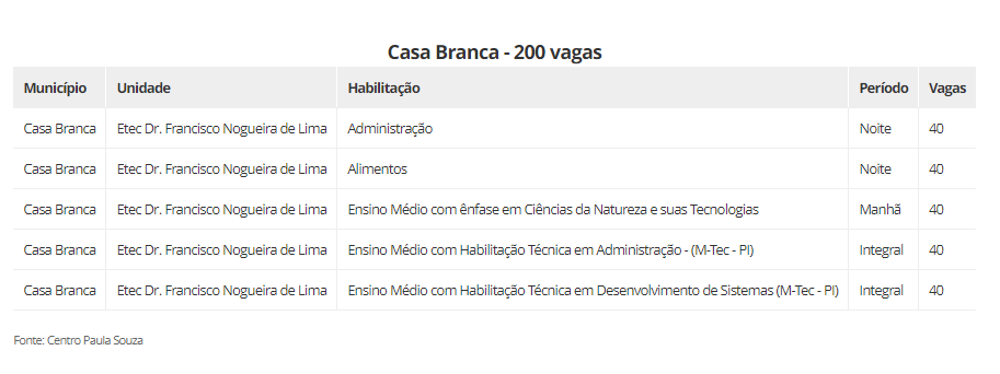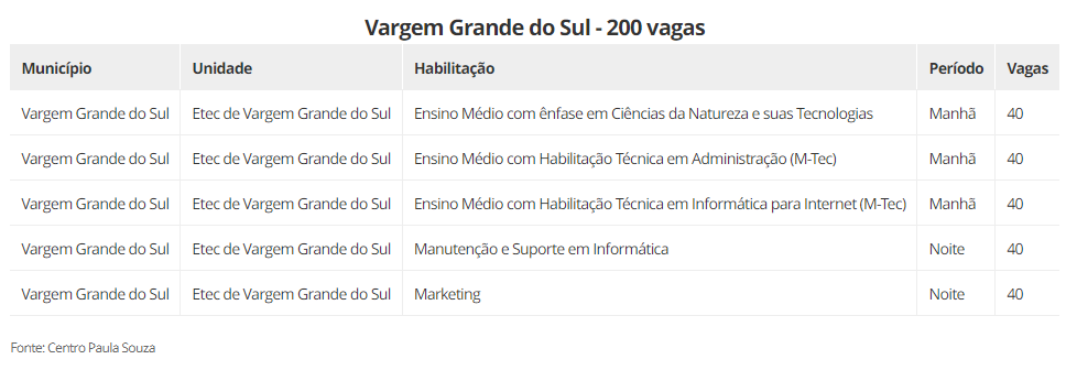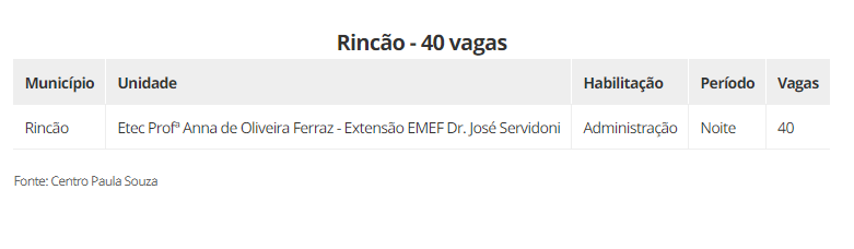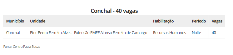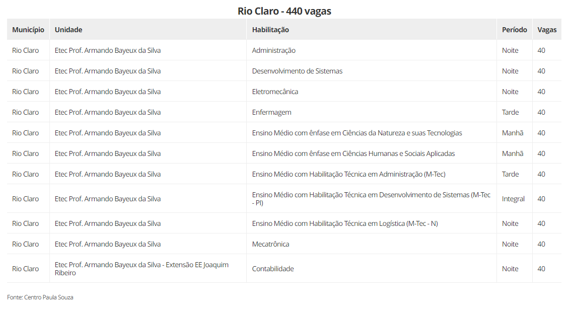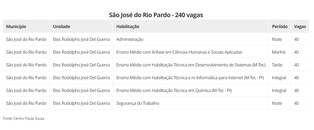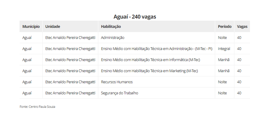 As vagas estão distribuidas em 22 cidades, são elas: Aguaí (240), Araraquara (600), Araras (520), Caconde (40), Casa Branca (200), Conchal (40), Ibaté (120), Leme (320), Matão (430), Mococa (840), Pirassununga (320), Porto Ferreira (140), Rincão (40) vagas, Rio Claro (440), Santa Cruz das Palmeiras (175), Santa Rita do Passa Quatro (80), São Carlos (560), São João da Boa Vista (40), São José do Rio Pardo (240), Tambaú (40), Tapiratiba (40) e Vargem Grande do Sul (200).