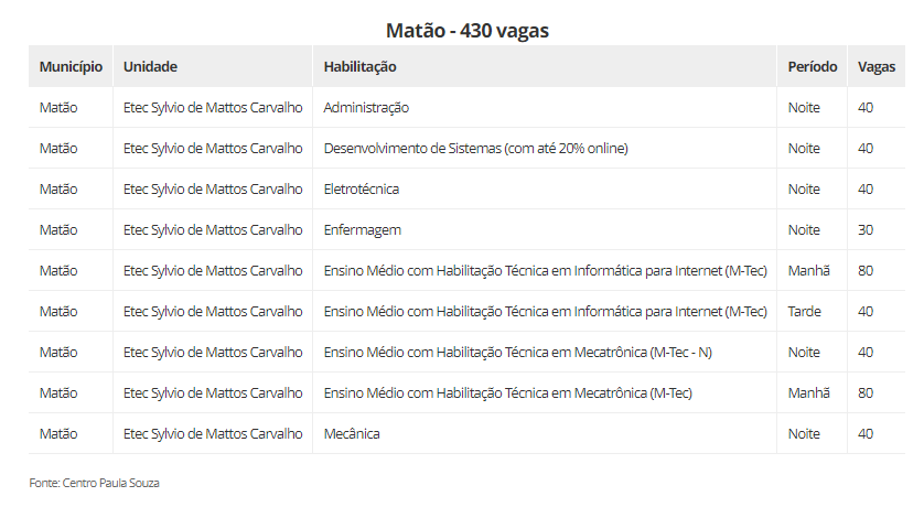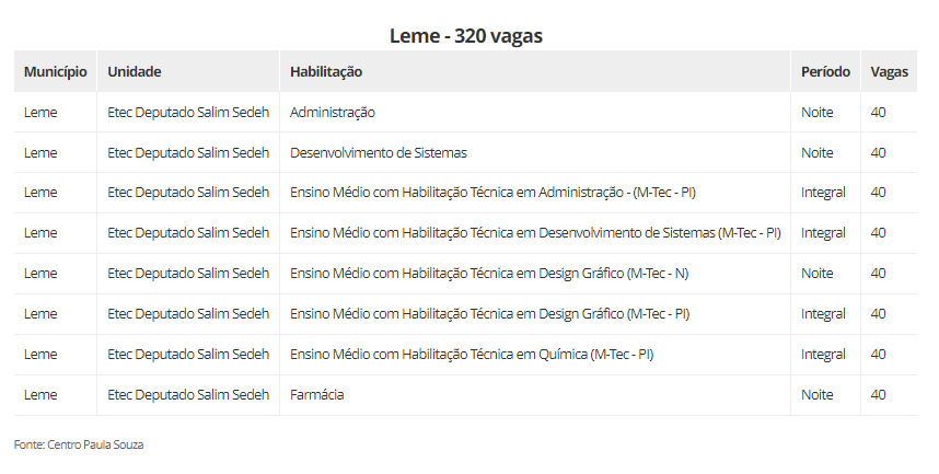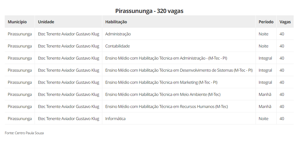 As oportunidades estão divididas entre cursos técnicos, ensino médio integrado ao técnico, ensino médio em diferentes itinerários formativos, articulação da formação profissional média e superior (AMS), especializações técnicas, além de vagas remanescentes de segundo módulo.