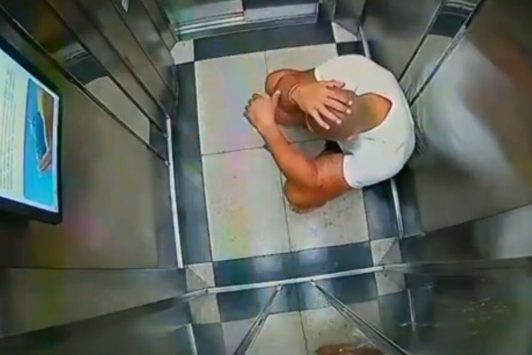Imagens de câmeras de segurança flagraram o comportamento de um homem suspeito de matar a esposa após a queda dela do 10º andar de um prédio. O vídeo registra o momento em que o investigado aparece em aparente estado de choque dentro do elevador logo após o ocorrido.