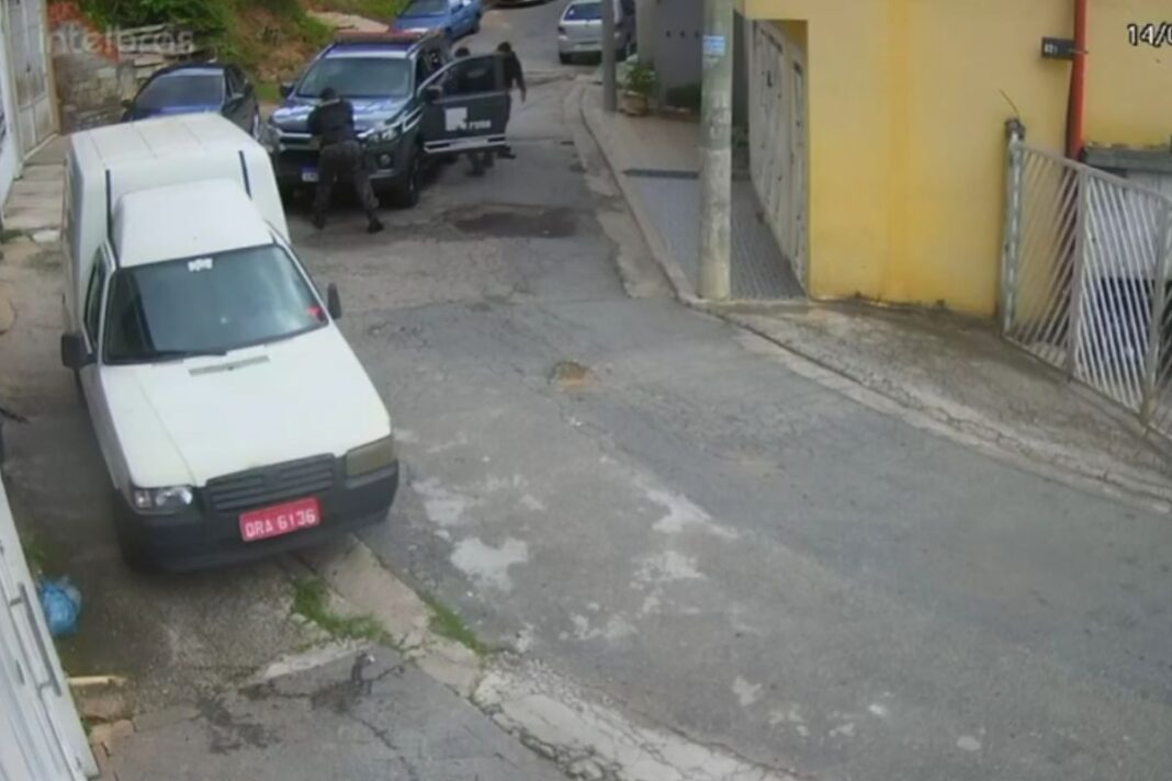 A ação foi registrada por câmera de segurança. As imagens mostram o momento em que o veículo da Rota emparelha com o carro do suspeito e um policial dispara de dentro da viatura. Não é possível visualizar o que ocorreu dentro do carro no instante do disparo.