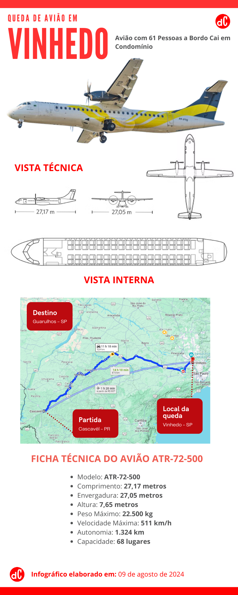 O ATR-72-500 da Voepass, fabricado pela ATR, é uma aeronave turboélice com 74 assentos, capacidade de voar a uma velocidade máxima de 511 km/h e autonomia de voo de 1.324 quilômetros. Com 14 anos de fabricação, o modelo é conhecido por sua habilidade de operar em pistas curtas e de difícil acesso, sendo amplamente utilizado em regiões como a Ásia, onde há registros de outros acidentes envolvendo este tipo de aeronave.